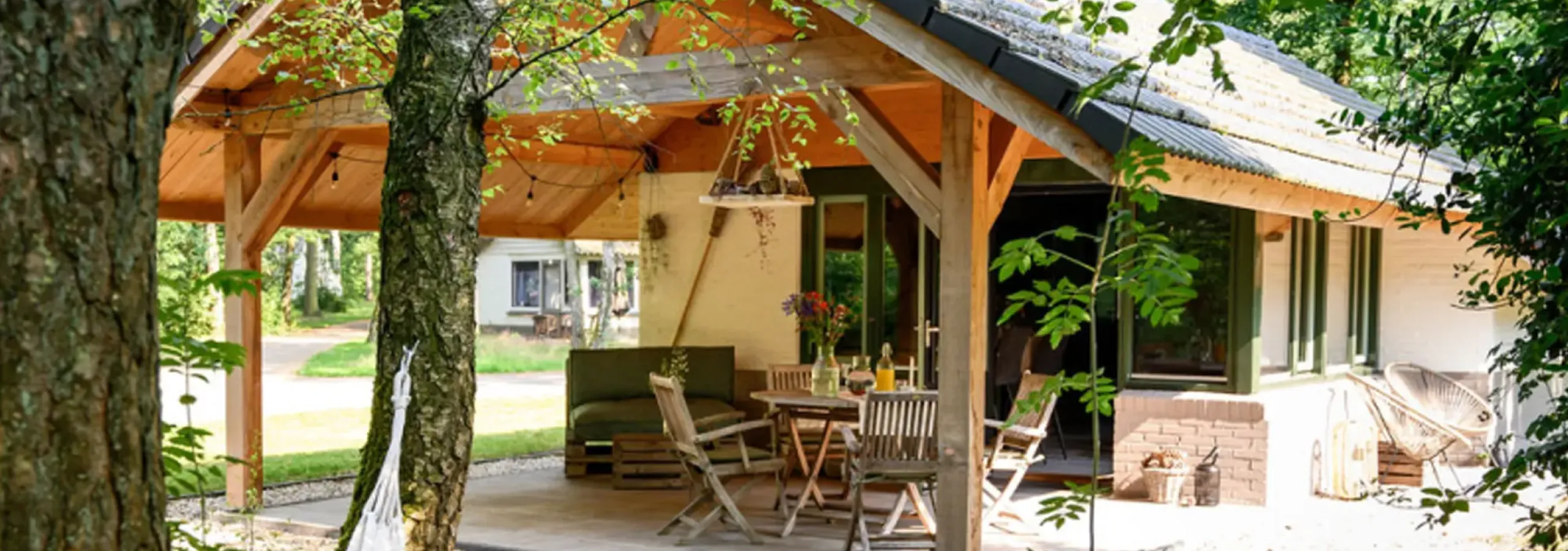 Bij lekker weer is het heerlijk vertoeven onder de royale houten overkapping. ’s Avonds nestelt u zich lekker aan de keukenbar of ploft u heerlijk languit op de bank. Het huisje is uitgerust met vloerverwarming, een luxe keuken die van alle gemakken voorzien is, en een badkamer met inloopdouche, wastafel en toilet.
